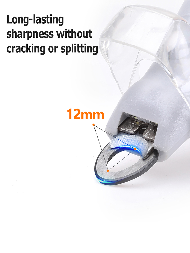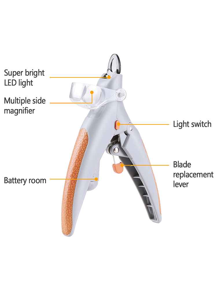 The Illuminated Nail Clipper for pets is a safe and easy way to clip your pet’s nails. The clippers have an LED light that lights up to help you see the bloodlines in light colored nails for easy and safe trimming. The wave shaped grip handle fits your hand comfortably providing smooth use and not easy to slip. The edge cover of the clipper blade has a magnify glass providing up to 5 times the magnification. The nail clippers have a nail trapper that collects your pet’s nail trimmings for easy disposal. Clippers use 3 LR44 batteries which are included.